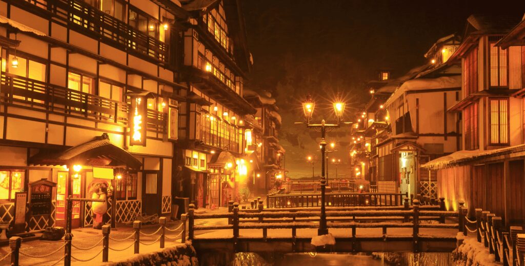 Ginzan Onsen, located in Obanazawa City, Yamagata Prefecture, is a hot spring town known for its Western-style wooden architecture dating from the Taisho to the early Showa periods. In winter, the town and its waterfalls are enveloped in snow, creating a mystical atmosphere. In addition to hot springs and natural beauty, Ginzan Onsen offers a rich culinary scene, foot baths, and historic sightseeing spots, providing a diverse range of experiences for visitors.