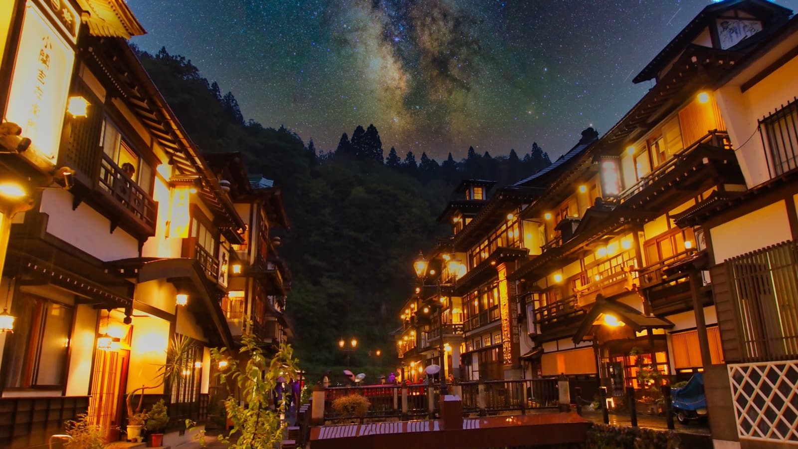 藤屋は銀山温泉の中心に位置しており、温泉街の情緒あふれる景観を楽しむのに最適です。藤屋の外観と銀山温泉の大正ロマン風景が一体となり、訪れる人々にタイムスリップしたかのような感覚を味わわせます。夜には温泉街全体がライトアップされ、その美しい景観を楽しみながら散策することもできます